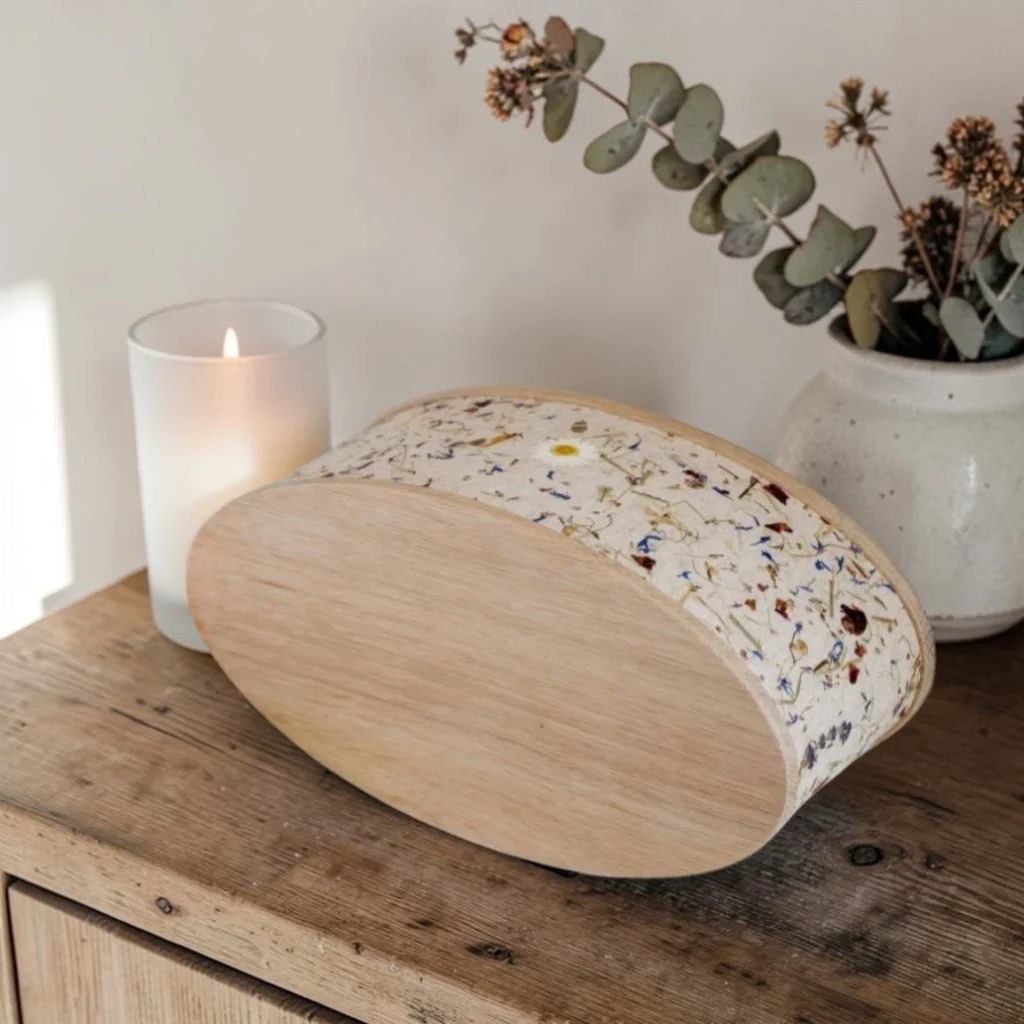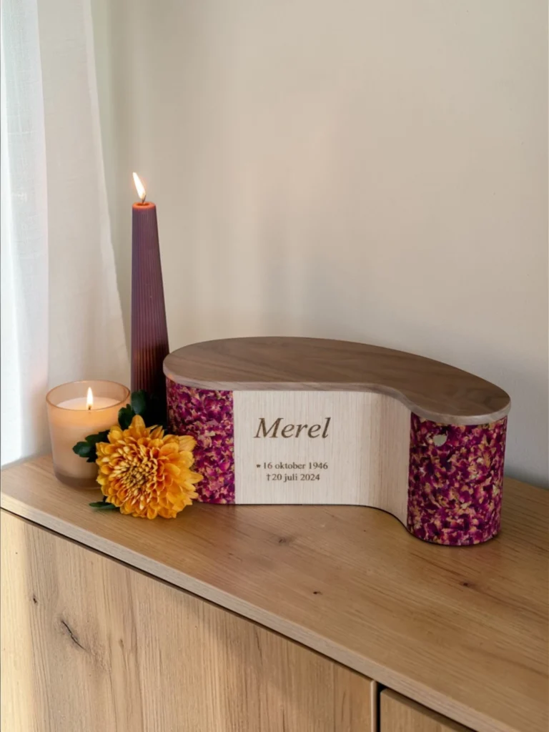 Duurzaam hout en zachte natuurlijke details, zoals subtiel geurende bloemenblaadjes, geven de urnen van Memingo een warme en natuurlijke stijl.