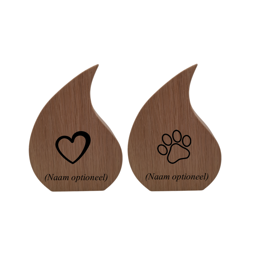 De traandruppel is gemaakt van hoogwaardige kwaliteit hout, bekend om zijn duurzaamheid en natuurlijke schoonheid. De ashouder is aan de onderzijde geplaatst en wordt afgedekt met een metalen plaatje, welke wordt gesloten met schroeven en lijm. Dit biedt een discrete en veilige manier om de as van je geliefde (huis)dier te bewaren.