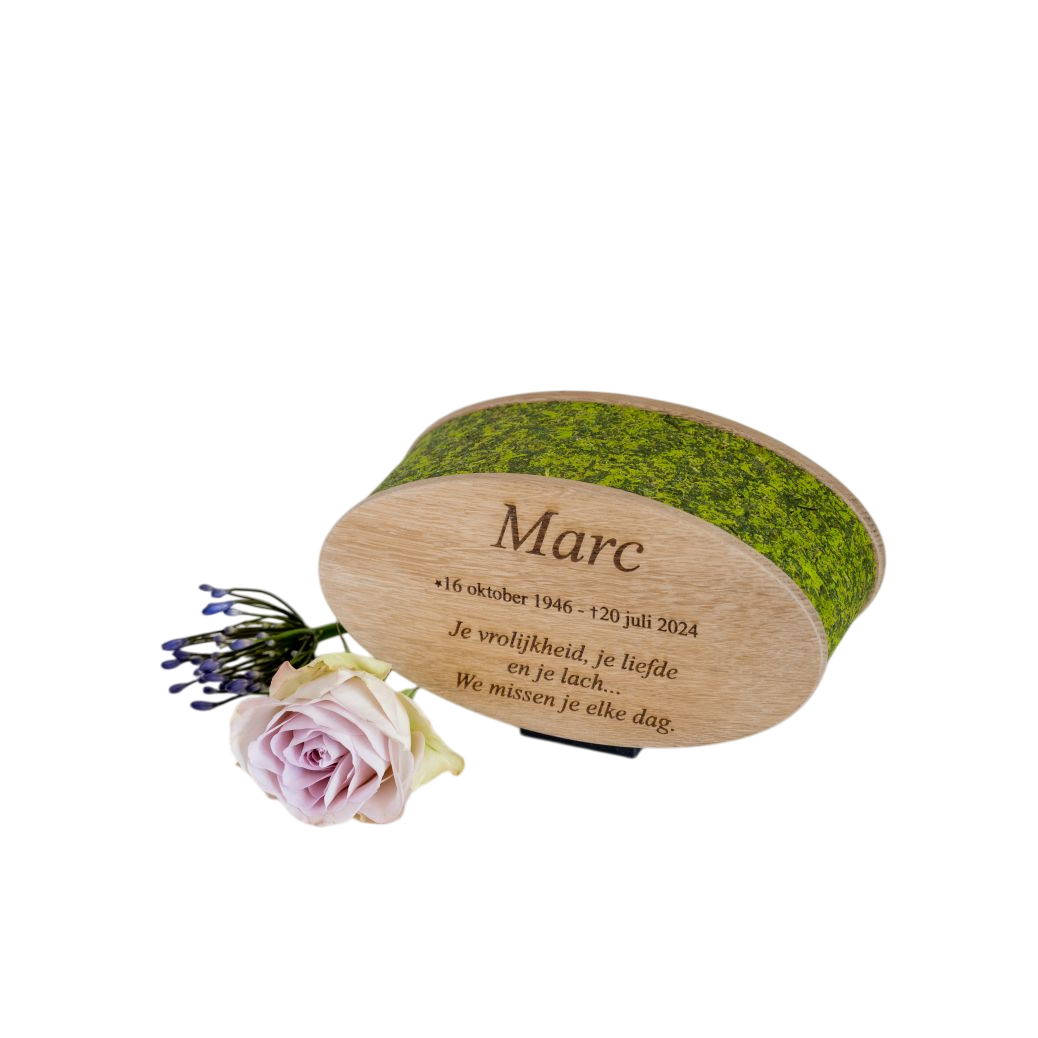 De Ovale Eikenhouten Urn met Geurend Mos – Fiore Moss wordt volledig met de hand gemaakt in ons eigen atelier. Elk stuk eikenhout wordt zorgvuldig geselecteerd en met aandacht gevormd tot een zachte, ovale urn. Door het ambachtelijke proces krijgt iedere urn een eigen karakter, waardoor het een persoonlijk en warm gedenk product wordt.